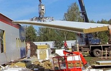 Завершены монтажные работы на городском рынке в г. Гатчина. Для монтажа кровельных панелей длиной до 13 м, толщиной 250 мм и весом 400 кг использовался вакуумный захват Clad Boy 4 в комплектации «Люкс».