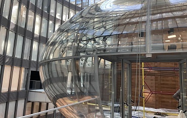 Вакуумный захват Arlifter GS-500 помог смонтировать необычное радиальное стекло в одном из бизнес-центров Петербурга.