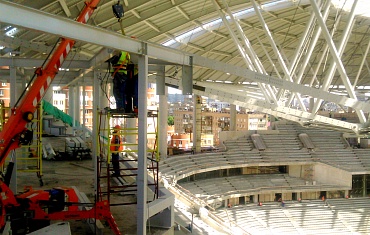 Ударными темпами, с помощью мини-крана Jekko SPD 360 и вакуумного захвата GS 500, произвели монтаж стеклянных ограждений на стадионе «Динамо»