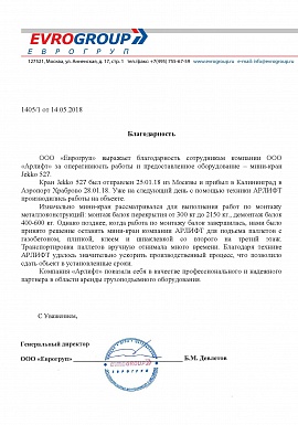 Благодарственное письмо от ООО "Еврогруп"