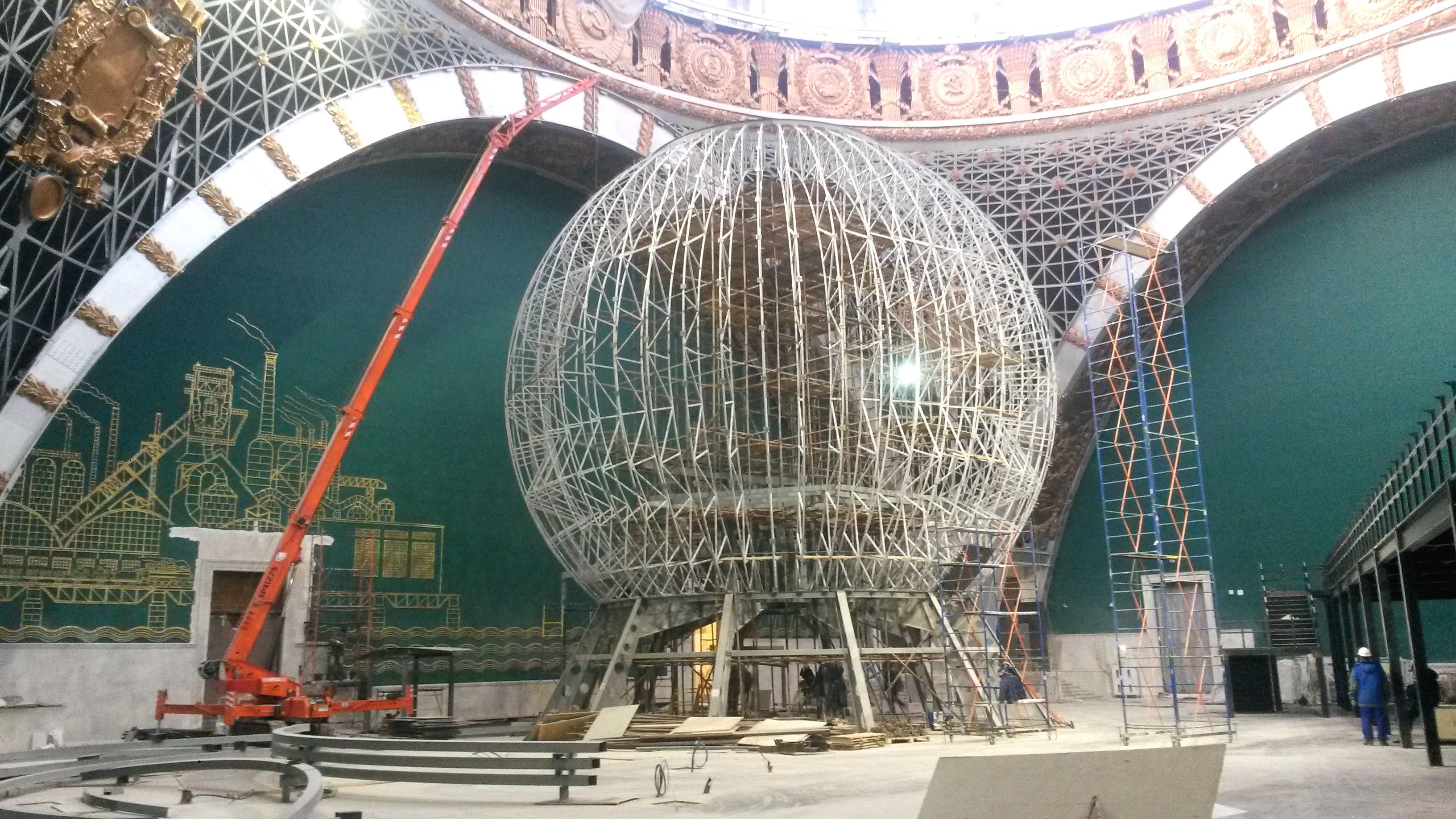 Монтаж ракеты восток и мультимедийного шара в комплексе «Космос» ВДНХ в Москве
